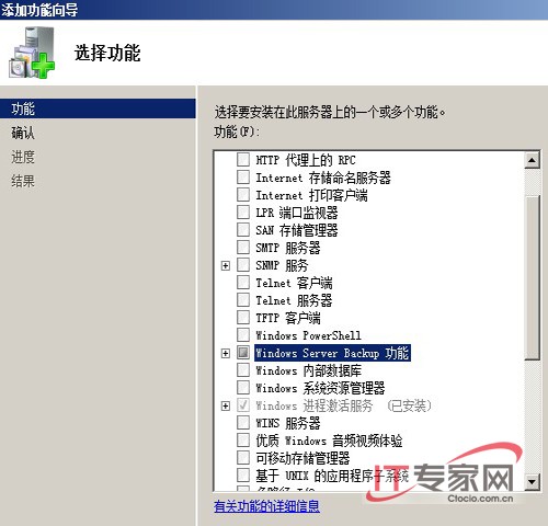 1、安裝Windows Server BackupWindows Server Backup工具已經(jīng)包含在所有版本的Windows Server 2008中,但默認狀態(tài)下它并沒有被安裝。要安裝Windows Server Backup工具,我們可通過服務(wù)器管理器來完成。在服務(wù)器管理器中從左側(cè)窗格選擇“功能”節(jié)點,然后單擊右側(cè)的“添加功能”鏈接,隨后會打開“添加功能向?qū)?rdquo;。在“選擇功能”界面中,選擇“Windows Server Backup”(建議同時選擇Windows Recovery Disc,該工具是還原工具)。在選擇Windows Server Backup功能時,Windows Server Backup和命令行工具選項都將被選中。單擊“下一步”,然后單擊“安裝”按鈕。在向?qū)О惭b完這些功能后,單擊“關(guān)閉”按鈕即可。至此,Windows Server Backup功能就成了管理工具鋼菜單下的一個選項,同時在“所有程序”→“維護”菜單下還將能看到“創(chuàng)建恢復(fù)盤”選項。(圖1)