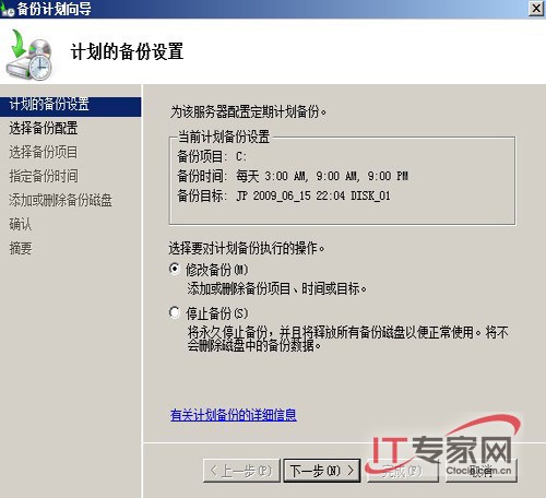 依據(jù)向?qū)нM入“計劃的備份設(shè)置”界面,在該界面中有兩個單選按鈕,如果希望添加或刪除備份項目、時間或目標,只需選中“修改備份”單選按鈕。如果希望停止計劃備份的運行,單擊“停止備份”單選按鈕。需要說明的是,停止備份會將磁盤空間釋放以供常規(guī)使用,但存在其中的備份并不會被刪除,在進行數(shù)據(jù)恢復(fù)時依然可以使用。最后,根據(jù)向?qū)瓿蓚浞萦媱澋膭?chuàng)建。(圖7)